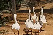 The entry gate to the museum gives an impressive greeting to the visitors. It has brass trumpets on the two pillars of the gate hoisted with "Harige" and Nandidwajas (flags of Nandi). The front face of the gate's leaves have images of Shiva and Vishnu embossed on them, which are cult figures of worship.[9][12] The gate leads to the Lok Mata Mandira, which is the information centre of the museum.[2] There is a flock of pet swans roaming around here.[13]