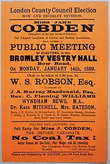 Under the Municipal Corporations Act of 1882 some women were qualified to vote in municipal elections, but were excluded from serving as councillors. However, the Local Government Act of 1888, which created county councils, was interpreted by some as allowing women's election to these new bodies.[31] On 17 November 1888 a group of Liberal women decided to test the legal position. They formed the Society for Promoting the Return of Women as County Councillors (SPRWCC), established an election fund of £400 and selected two women—Jane Cobden and Margaret Sandhurst— as Liberal candidates for the newly created London County Council. Cobden was adopted by the party's Bow and Bromley division, and Sandhurst by Brixton.[32] Despite objections from the Conservatives, the women's nominations were accepted by the local returning officers.[33] Cobden's campaign in Bow and Bromley was organised with considerable enthusiasm and efficiency by the 29-year-old George Lansbury, then a Radical Liberal, later a socialist and eventually leader of the Labour Party.[34] Both Cobden and Sandhurst were victorious in the elections on 19 January 1889; they were joined by Emma Cons, whom the Progressive majority on the council selected to serve as an alderman.[35]