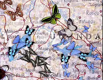 Many of her works are based on dreams, such as a recent series of works in which butterflies are laid over maps of various countries. She explains her approach to painting thus: