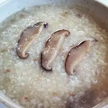 Jangguk-juk (장국죽) is a juk, or Korean porridge, made by boiling rice in malgeun-jangguk (맑은장국), a soup soy sauce-based beef broth made with seasoned ground beef stir-fried in sesame oil.[2][3] The porridge is referred to as uyuk-juk (우육죽; 牛肉粥; "beef porridge") in Jeungbo sallim gyeongje, a 1766 book.[4]