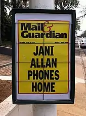 In an article published by the Sunday Times on 23 July 1989, Allan recalled a significant episode when Terre'Blanche had drunkenly hammered on her flat door and eventually slept on the doorstep and that she had to step over him the next morning.[122] Despite her objections, her editor, Myburgh, insisted on publishing answering machine messages allegedly by Terre'Blanche, accompanied by a denial by Allan of counter claims that he had made against her. Allan recounted conversations with her editor "After the bomb he said, 'Right, we'll publish the tapes.' I said I didn't think that would be wise, as the security police had told me my life would be in danger. He said, 'We're going to blow them out of the water.'" She had just emerged from a course of traction for her seized back and was then rushed to hospital with a bleeding ulcer because of the stress.[10][123][124] Allan fled to Britain for security reasons in the same week that the transcripts were published.[125] The tapes were the Sunday Times lead story published on 30 July 1989 with the front-page headline 'JANI: MY ET TAPES'.[126]