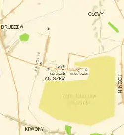 Janiszew [jaˈniʂɛf] is located in the centre of Brudzew administrative district of Poland, near the Koźmin strip of Adamów Brown Coal Mine, on a small river called Struga Janiszewska. The village lies on local road from Brudzew to Koźmin, about 10 kilometers from Turek, and 2 kilometers from Brudzew. Janiszew consists of the so-called Parcele, Poduchowne, Ostrów, and Stara Wieś of which only a giant hole of the strip mine remains today. The village adjoins Brudzew, Krwony, Głowy and Koźmin and is located about 100–105 meters above sea level.[1]