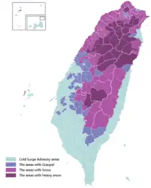 A surge of cold air during the weekend of January 22–24 brought temperatures as low as 4 °C (39 °F) to Taipei, the lowest temperatures in 44 years. Sleet was observed in Taipei City at 16:00 on 24 January.[3] Yangmingshan, the Matsu Islands, and Kinmen all observed their coldest temperatures on record at −3.7 °C (25.3 °F), 0.3 °C (32.5 °F), and 1.3 °C (34.3 °F), respectively.[18] Due to the subtropical climate,[19] many homes do not have central heating or insulation, and residents struggled to cope with the temperatures. Overall, at least 85 people died from hypothermia and cardiac arrest in Taiwan, including 66 people in Taipei and Taoyuan, and another 16 in Kaohsiung. The majority of victims died in their homes.[3] The Ministry of Health subsequently claimed only three people died and 45 were admitted to hospital emergency wards.[20] In Su'ao, Yilan measured 5 °C (41 °F), Touwu, Taoyuan measured 4.2 °C (39.6 °F), and Hsinchu City measured 2.8 °C (37.0 °F). Snow accumulated to 16.2 cm (6.38 in) on Jade Mountain.[12]