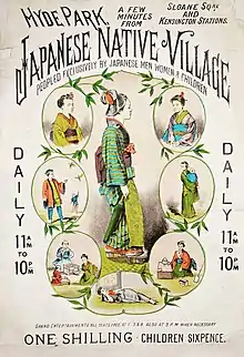The exhibition was built to resemble a traditional Japanese village, completely contained within Humphreys' Hall (which was south of Knightsbridge and east of what is now Trevor Street).[4] It employed around 100 Japanese men and women, and included segregated sleeping accommodation. According to advertisements placed in the Illustrated London News,