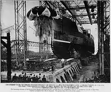 The keel of Haruna was laid down at Kobe by Kawasaki on 16 March 1912, with most of the parts used in her construction manufactured in Japan.[2] Due to a shortage of available slipways, Haruna and her sister ship Kirishima were the first two capital ships of the Imperial Japanese Navy to be built in private shipyards.[2] Launched on 14 December 1913, Haruna's fitting-out began in early 1914.[1] She was completed on 19 April 1915.[2]