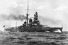Haruna was reactivated and assigned to the 1st Battleship Division on 20 May 1933.[5] However, on 1 August 1933, Haruna was drydocked at Kure Naval Arsenal in preparation for upgrades that would enable her to escort Japan's growing fleet of aircraft carriers.[5] Her stern was lengthened by 26 ft (7.9 m), and her bridge was completely reconstructed according to Japan's pagoda mast style of forward superstructure.[4] Her 16 older boilers were removed and replaced with 11 oil-fired Kampon Boilers and newer geared turbines.[1] Catapults and rails were added to support three Nakajima E8N or Kawanishi E7K reconnaissance and spotter floatplanes.[16]