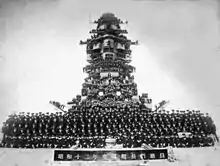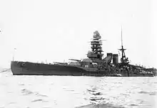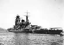 Around 1926, the four above-water torpedo tubes were removed and the ship received three additional 76 mm AA guns that were situated around the base of the foremast.[16] They were replaced by eight 40-caliber 12.7-centimeter Type 89 dual-purpose (DP) guns in 1932,[7] fitted on both sides of the fore and aft superstructures in four twin-gun mounts.[17] When firing at surface targets, the guns had a range of 14,700 meters (16,100 yd); they had a maximum ceiling of 9,440 meters (30,970 ft) at their maximum elevation of +90 degrees. Their maximum rate of fire was 14 rounds a minute, but their sustained rate of fire was around eight rounds per minute.[18] Two twin-gun mounts for license-built Vickers two-pounder light AA guns were also added to the ship that same year.[7][Note 2] These guns had a maximum elevation of +80 degrees which gave them a ceiling of 4,000 meters (13,000 ft).[20] They had a maximum rate of fire of 200 rounds per minute.[21]