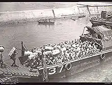 Following the British declaration of war on the Japanese empire, the leadership of the BPC urged the Australian government to assist in the evacuation of BPC employees.[8] The authorities were slow to respond, due to reports speculating that an invasion of the island by Japan was unlikely because of the lack of a deep-water port or an airstrip. Their reluctance was also fuelled by the belief that withdrawal of the Westerners would result in a loss of prestige for Australia among the Nauruans. The evacuation was finally approved at the end of January 1942.[8] The initial plan was to remove all the Westerners and Chinese. Because of growing Japanese naval activity in the area, Le Triomphant, a destroyer operating with the Free French Naval Forces, was selected for the mission.[8] The ship met with the BPC freighter Trienza, which was camouflaged in the bay of Malekula in the New Hebrides islands, loaded with 50 tons of supplies bound for Nauru.[8] After taking some of Trienza's cargo aboard, Le Triomphant steamed at full speed toward Nauru, arriving on 23 February. The unloading of supplies and boarding of civilians proceeded quickly. Contrary to the initial plan, it was decided to take aboard only part of the Chinese population, due to cramped conditions on the ship.[8] Sixty-one Westerners, 391 Chinese, and the 49 members of the British garrison embarked; 191 Chinese were left on Nauru,[11] having been told they would be evacuated later, which, in the event, did not occur, due to the rapid pace of the Japanese advance.[12] Seven Westerners, including Chalmers and two missionaries, chose to remain, feeling it was their duty to look after the islanders. After this evacuation, there were some 1,800 Nauruans, 190 Gilbertese, and 200 Chinese on Nauru (Gilbertese from the British colony of Gilbert and Ellice Islands and Chinese from British Hong Kong were brought as laborers by BPC before the war). Before evacuating, BPC employees thoroughly sabotaged the phosphate mining facilities.[13]