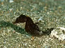 The Japanese seahorse (in Japanese, kitano-umi-uma and sangotatsu) or lemur-tail seahorse (Hippocampus mohnikei) is a species of fish in the family Syngnathidae. The Japanese seahorse reaches a maximum length of 8.0 cm, is usually dark brown and has a relatively long tail, a ridgelike coronet and flattened spines. Many seahorse species look similar, so in addition to any distinguishing features, individual specimens are identified using a series of specific measurements and counts of anatomical features such as spines and tail rings.