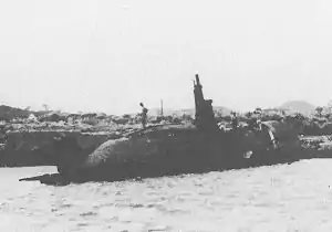 After spending the night of 12–13 August 1945 at Moji, she resumed her voyage on the morning of 13 August.[2] She was on the surface off Hesaki Lighthouse that day when she detonated an acoustic mine.[2] The explosion blew two of her lookouts overboard, started a fire aft and a minor leak in her main ballast tanks, and brought her to a halt.[2] A minesweeper arrived and towed her to Mitsubishi′s Hikoshima Shipyard at Shimonoseki, where she unloaded the two Type 95 torpedoes she had aboard.[2]