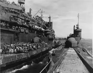 After loading Japanese motor launches onto their decks to serve as lifeboats, I-400, I-401, and I-14 departed Sasebo on 11 December 1945 under escort by Greenlet bound for Pearl Harbor, Hawaii, stopping along the way at Apra Harbor on Guam in the Mariana Islands from 18 to 21 December 1945, then at Eniwetok in the Marshall Islands, and then at Kwajalein for food and supplies from 26 to 27 December 1945.[3] They arrived at Pearl Harbor on 6 January 1946 and tied up at the Submarine Base, where a U.S. Navy band and local celebrities welcomed them.[3] On 18 February 1946, I-400 entered drydock at Pearl Harbor for evaluation.[3]