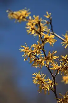 Hamamelis japonica, Japanese witch-hazel, is a species of flowering plant in the family Hamamelidaceae, native to Japan but widely cultivated in temperate situations elsewhere. A horizontally spreading, hardy deciduous shrub or small tree, it is notable for the slightly fragrant yellow blooms which clothe its naked branches in the depths of winter through to early spring (usually in January and February). The green leaves follow, and in favourable locations they turn yellow before dropping in autumn.[3]