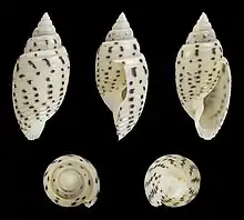 • Description: found on sandy bottoms; whitish shell; first whorl with lighbrown color bordered with darker brown bands.