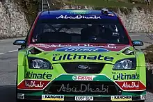 In 2008, Latvala joined Ford's factory team as a number two driver, partnering Mikko Hirvonen and replacing Marcus Grönholm who had announced his retirement from the WRC at the end of 2007.[8] The opening round of the season wasn't lucky for the young Finn – he suffered a puncture after cutting a corner too deep on the very first stage and lost even more time because of a non-fully operative pneumatic wrench.[9] Latvala continued to fight and was ninth overall before SS12, but he made another mistake there and heavily damaged the front left suspension in his Focus, forcing himself to retire for good.[10] At the second rally of the season, 2008 Swedish Rally, he had good pace from the beginning – he won all regular special stages on day one, pulling away from the runner-up spot slowly, but consistently. He later had some problems[11] and wasn't the fastest on any of the remaining stages, but managed to keep his position throughout the rally. The 22-year-old therefore took his first WRC win to become the youngest winner in the history of the World Rally Championship. The previous record was held by Henri Toivonen who was 24 years and 86 days old when he won the 1980 RAC Rally.[12] For his performance during the Swedish rally Latvala was given the Abu Dhabi Spirit Of The Rally award.[13] At the first gravel event of the season, the 2008 Rally México, despite officially claiming no intentions to win the event,[14] he was the fastest driver on the first two stages and was leading the rally throughout the first day, pulling out from the current World Rally Champion, Sébastien Loeb. Unfortunately for the young Finn, the turbo in his Ford Focus was malfunctioning during the second day, making his car uncompetitive. This, along with having to be the opening driver on the stages 9–16, having to sweep the track of the loose gravel, cost him a substantial amount of time and Latvala finished the rally third.[15]