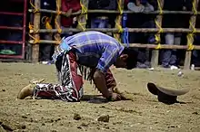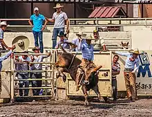 The word Jaripeo derived from the Purépecha language in the Mexican state of Michoacán comes from Xarhipeo, the name of a village in said state.[1] Dating back to 16th century Mexico, Jaripeo was originally a form of bull fighting in which the rider rode the bull to death.[2] The Jaripeo later evolved to be seen as a test of courage rather than to just simply ride the bull to death. The modern objective of this event is to attempt to ride the bull until it becomes tame and stops bucking. At the present time, most of the occasions these events are organized are during the fiestas patronales, festivities that celebrate the religious entity that represents the town. Those in charge of creating the jaripeos are usually the local government helped by with ranchers from the region.