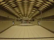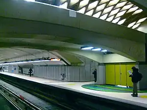 The station, designed by Lemoyne, Bland, Edwards, & Shine, is a normal side platform station, built in tunnel. The mezzanine near the north end is connected to an entrance integrated into the ground floor of an apartment building. The station is known for the diamond-shaped caissons in the ceiling of the transept.