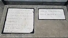 In 1889, Smith built a large commercial building at the intersection of Peachtree Street and Forsyth Street. The building, called "The House That Jack Built", was constructed of granite blocks that had proven unusable for street paving purposes and adorned with marble slabs that had different phrases and sayings, including many Biblical verses.[6] When Smith leased the building and property in 1909, he stipulated that the inscribed slabs should be displayed prominently in any future building or structure built on the property.[7] When MARTA built the Peachtree Center station on the property in 1982, they relocated two of the slabs to a fenced-off area near the subway station entrance, where they still lie.[6]