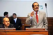 On November 16, 2012, Diez Canseco was suspended from Congress without pay for 90 days by a vote of a full session of the Congress after the Congressional Ethics Commission found that he had violated the Parliamentary Code of Ethics in presenting bill nº054/2011, which would have, according to the charges, financially benefited his daughter and ex-wife.[9][10] The motion for suspension was presented although the Ethics Commission's own Technical Board had found that no ethics violation had taken place. The result of the vote was 130 congressmen: 55 voted in favor, 31 against, 4 abstentions and 40 did not vote because they were suspended (4) and absent (36). For his part, Diez Canseco denied any wrongdoing and accused political opponents, including First Lady Nadine Heredia, of colluding against him.[11][12] However, said measure was annulled on April 4 by the Fifth Constitutional Court of Lima, in response to an amparo action filed by the legislator, since the sanction affected due process, the right to defense and honor of the congressman.[13] The president of the Parliamentary Ethics Commission, Congressman Humberto Lay Sun, announced that they would appeal the ruling.