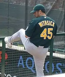 He missed most of the 2003 season with a strained tendon in his elbow,[20][21][22] appearing in only 46 games. He was 3–7 with a 4.53 ERA. In his second season, he rebounded with a 3.21 ERA in 44 games. He was a free agent after the season and signed a one-year deal with the Colorado Rockies.[23] In 32 games with the Rockies, he was 0–4 with a 2.52 ERA before being traded to the Oakland A's in a deal that sent Eric Byrnes to the Rockies.[24] After the deal, he was 1–1 in 27+2⁄3 innings. After the 2005 season ended, Witasick signed a two-year contract to remain with the Athletics.[25][26]