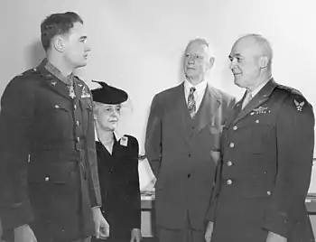 Gen. "Hap" Arnold presents Jay Zeamer Jr. with the Medal of Honor as parents Jay and Margery Zeamer look on (1944)