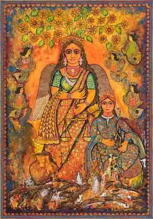 Her primary painting mediums are watercolours, ink, charcoal and acrylic on canvas. Most often centring on nature, gods and goddesses, her original depictions combine folk, myth and mythology to tell stories of deities who braved adversities. [4]