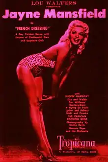 Her wardrobe for the shows at Tropicana and Dunes featured a gold mesh dress with sequins to cover her nipples and pubic region.[114][119][130] That controversial sheer dress was referred to as "Jayne Mansfield and a few sequins".[122] In early 1963, she performed in her first club engagement outside Las Vegas, at the Plantation Supper Club in Greensboro, North Carolina, earning $23,000 in a week ($220,000 in 2022 dollars), and then at Iroquois Gardens in Louisville, Kentucky.[131] She returned to Las Vegas in 1966, but her show was staged on Fremont Street, away from the Strip where the Tropicana and Dunes were.[119] Her last nightclub act French Dressing was at the Latin Quarter in New York in 1966, also repeated at the Tropicana.[129] It was a modified version of the Tropicana show, and ran for six weeks with fair success.[132]
