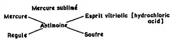 Jean Beguin (1550–1620) was an iatrochemist noted for his 1610 Tyrocinium Chymicum (Begin Chemistry) (Digital edition), which many consider to be one of the first chemistry textbooks. In the 1615 edition of his textbook, Beguin made the first-ever chemical equation or rudimentary reaction diagrams, showing the results of reactions in which there are two or more reagents.[1] Modern rendering of this famous diagram, detailing the reaction of corrosive sublimate (HgCl2) with sulfide of antimony (Sb2S3), is shown below:[2]