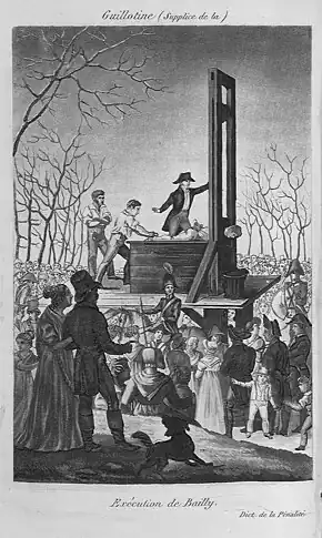 In July 1793, Bailly left Nantes to join his friend Pierre-Simon Laplace at Melun, but was recognized there and arrested. On 14 October, he was pressed to testify against Marie Antoinette but refused. On 10 November 1793, he was brought before the Revolutionary Tribunal in Paris, speedily tried, and sentenced to death the next day. On 12 November 1793, he was guillotined at the Champ de Mars, a site selected symbolically as the location of his betrayal of the democratic movement. The little red flag he had used to give the order to fire on the crowds on the Champs de Mars was tied to the cart that took him to his death, and burned in front of him before he was executed.[15] It was the revival of this event after 10 August in 1793 along with the persecution of Marat that led to the death of Bailly.[14]: 213 He was forced to endure the freezing rain and the insults of a howling mob. When a scoffer shouted, "Tu trembles, Bailly?" ("Do you tremble, Bailly?"), he responded, "Oui, mais c'est seulement de froid" ("Yes, but it is only the cold").