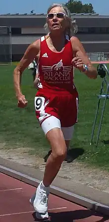 Daprano holds the current world records in the W70 mile, W75 400 metres, 800 metres,[3] in addition to the pending W75 mile record. Indoors she hold the W75 records in those same events and is on the W60 4x400 metres relay.[4] She also holds the American records in the W70 400 metres, W65 and W70 800 metres, and W70 1500 metres. And the W75 mile improves the record by so much, it is also superior to the W75 American record in the 1500, a race that is 109.35 metres shorter. Daprano's late husband, Bill, about ten years her senior was also an active masters athlete and was part of two American record holding relay teams.[5] They were married 22 years before his death in 2021. Just 17 days after Bill's death, Jeanne died from Parkinson's disease on December 1, 2021.