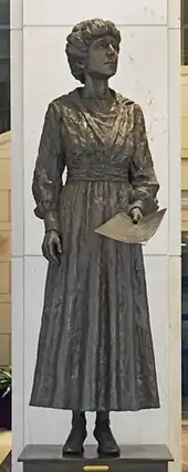 A statue of Rankin by Terry Mimnaugh, inscribed "I Cannot Vote For War", was placed in the United States Capitol's Statuary Hall in 1985. At its dedication, historian Joan Hoff-Wilson called Rankin "one of the most controversial and unique women in Montana and American political history".[38] A replica stands in Montana's capitol building in Helena.[7] In 1993, Rankin was inducted into the National Women's Hall of Fame.[59]