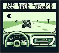 There are several options in the game including: difficulty level, whether to race in MPH or KM/H, steering ability, whether or not to have a track map, chevrons, and position flashing. The object is to race laps around a muddy race track while trying to get first place. There are twenty tracks to race in, each with a timer that forces the player to race fast.[4] There is an option to either do a single race or a multi-race tournament against a computer opponent or through a human playing while using the Game Boy link cable and another copy of the video game.[1][4] Items in the background like electric lines and rocks help provide a road-like feeling to the races.