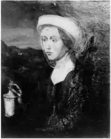 The Renders Magdalena is a portrait of Mary Magdalene, that was claimed to be a copy of the right panel of the Braque Triptych by Rogier van der Weyden, the original of which hangs in The Louvre. The Renders Magdalena started as a bad old copy, which was acquired by a collector in Antwerp around 1885 and then bequeathed to the museum of Ghent in 1914. The museum refused the painting because of its mediocrity and put it up for sale in Ghent in 1920. It was bought by an antique dealer in Dendermonde from whom Renders acquired it.[4] Renders asked Van der Veken to restore the painting. When the painting reappeared 6 years later at an exhibition in Bern, the painting had been drastically changed. What had appeared a mediocre copy had become a masterpiece that was attributed to the entourage of Hans Memling.[3] However, not all contemporary art experts were impressed by this metamorphosis and they raised doubts about the work's authenticity.[7]