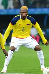 In June 2018, he was named in José Pékerman's final 23-man squad for the 2018 FIFA World Cup in Russia.[41] He made his World Cup debut as a starter in Colombia's opening group-stage match against Japan, where Colombia lost 1–2 with Carlos Sánchez receiving a red card in the third minute of the match for a suspected handball.[42] Lerma would go on to dispute all of Colombia's remaining matches as his country exited in the round of 16 after losing to England on penalties.[43]