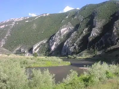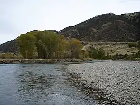 The geology of the Jefferson River and the surrounding mountain ranges includes some of the oldest rocks found in North America, dating back to the Archean Eon, 2.7 billion years ago.[7] Found primarily in the Tobacco Root and Ruby ranges, these ancient rocks are metamorphic, having been highly compressed and nearly re-melted by geologic forces over eons of time. Frequently found along the Jefferson River, these rocks include layered feldspars, gneiss, glassy quartz, heavy dark amphibolite, and sometimes marble.[8]