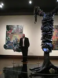![]() Gibson speaking at the Eiteljorg Museum in 2009. His artwork Mythmaker is in the foreground and Second Nature in the background. | |