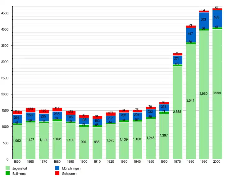 Jegenstorf has a population (as of 31 December 2020) of 5,738.[11] As of 2014, 10.0% of the population are resident foreign nationals. Over the last 4 years (2010-2014) the population has changed at a rate of 6.25%. The birth rate in the municipality, in 2014, was 10.5, while the death rate was 6.8 per thousand residents.[9]