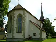 A local priest for the village church was first mentioned in 1180. The Jegenstorf family had patronage rights for the church. After the family died out, several Bernese patrician families had the patronage right. In 1424 the Niedere Spital (Lower Hospital) took the church over. The current building was built in 1514-15 and the stained glass is from the 16th and 17th century. In 1528 Jegenstorf accepted the Protestant Reformation along with most of the Canton of Bern. The parish of Jegenstorf was much larger than the political municipality. It included the municipalities of Ballmoos, Iffwil, Jegenstorf, Münchringen, Oberscheunen, Zauggenried, Zuzwil, Mattstetten and Urtenen-Schönbühl.[4]