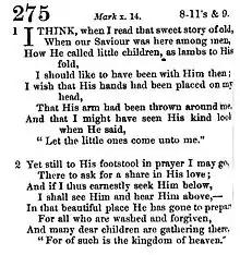 Remaining at her father's home in Taunton, Somerset, Jemima was teaching hymns to school children in nearby Blagdon, when one summer morning in 1841 while riding the stage from Taunton to Wellington, she composed some verses on the back of an envelope for a hymn that she named "The Child's Desire." When her hymn proved to be very popular with the children she was working with, her father published it in the Sunday School Teacher's Magazine (1841), which led to her becoming editor from 1841 to 1845 of The Missionary Repository, a new missionary magazine for children. Her hymn next appeared untitled and anonymously in 1853 as hymn no. 874 (in 3 stanzas of 8 lines) in the widely read The Leeds Hymn-book, which led to subsequent publication in a number of Victorian hymnals. Because it appeared without a title in the Leeds book, it came to be known by the opening verse of "I think when I read that sweet story of old,", or simply either "The Old Sweet Story" or "The Story of Old".[3][5] Although her fame generally rests on this one hymn, she went one to write several books, including, The Female Jesuit (1851), The Broad Road and the Narrow Way, a Memoir of Eliza Ann Harris of Clifton (1859), Winter Work (1864), Sketches of the life and character of Thomas Thompson (1868), which is a biography of her father, and her autobiography, The Early Years of my Life (1900).