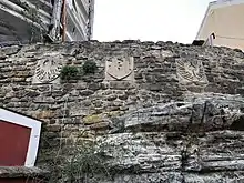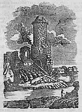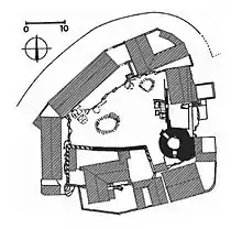 An unusual oval shape excelled in the castle's layout and the 28-meter-high tower is the first visible part of the castle. A castle core has a triangular shape.The oldest building structure is located only in a sub-part of Bergfried and the adjacent part of the wall, which is lined with smaller stones. Three palace wings surrounded the small courtyard. The north disappeared almost without a trace, because the rock below was largely excavated. From the front palace on the east side stood a part of the courtyard wall with arched entrance to the basement. A small fragment of the portal lining in the same wall illustrates the height of the original entrance. The courtyard and parts of the side walls have been preserved from the third palace.[5] The dominant feature of the preserved part of the castle is a 28-meter-high round tower on which are three coats of arms of the owners carved from sandstone are placed at the entrance. On the second floor of the tower is a chapel on a circular ground plan. A wooden spiral staircase leads through the tower. Remains of the circumferential walls of the former palace are preserved in the courtyard. The tower was raised by Jan of Jenštejn, which can be seen in follow-up of narrower upper part to the wider lower one. This was used as a walkway for guards, later it was converted to a covered gallery.[4] The original entrance was on the first floor after a drawbridge, but later a new one was created on the ground floor. The tower was covered with a stone helmet with four dormers, the remains of the roofing can be seen on the old engravings (still visible on 19th century engravings).[4]