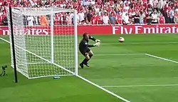 The highlight of Lehmann's international career came in the quarterfinal match (30 June 2006, Olympiastadion, Berlin) against Argentina. The game remained tied 1–1 after 90 minutes and extra time. The game came down to penalty kicks and Lehmann carried his team through, picking the right direction for all spot kicks, making saves from Argentinians Roberto Ayala and Esteban Cambiasso and almost saving a third. Meanwhile, the Germans made all four of the necessary spot kicks to win the penalty shoot-out 4–2. Lehmann's prowess in the shootout was aided by notes given to him before the kicks – an idea from Germany's chief scout, Swiss-born Urs Siegenthaler. Germany's goalkeeping manager, Andreas Köpke, gave Lehmann a sheet of paper with the penalty tendencies of seven of the Argentinians, with Lehmann keeping the paper in his right sock.[37] Only two of the seven players on the note (Ayala and Maxi Rodríguez) ended up taking penalties, but Köpke had predicted both correctly and Lehmann saved Ayala's kick.[37] Before the last shot from Cambiasso, Lehmann looked at the paper for a long time even though Cambiasso's name was not even on it. Lehmann then saved the penalty, ending the game.[37] The story about the paper features in the film Deutschland. Ein Sommermärchen. Lehmann was considered a hero by the German public after these saves, and he received praise even from long-time rival and backup keeper Oliver Kahn.[38]