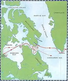 On 9 May 1619, under the auspices of Christian IV, Munk set out with 65 men and two of His Royal Majesty's ships, the frigate Enhiörningen (Unicorn) and the sloop Lamprenen (Lamprey). Both were outfitted under his own supervision.[8] His mission was to discover the Northwest Passage to the East Indies and China. His crew included Rasmus Jensen, a priest who is now recognized to be the first Lutheran cleric in Canada. Munk penetrated Davis Strait as far north as 69°, found Frobisher Bay,[9] and then spent almost a month fighting his way through Hudson Strait.