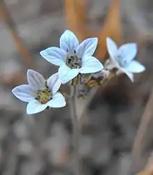 The leaves typically emerge after flowering has completed, although some emerge before this. In very dry years, no leaves may be produced at all. This species produces the fewest inflorescences per plant and the fewest flowers per inflorescence in the genus. It also has the shortest flowering period in the genus.[5] This species is heterostylous, meaning that the flowers have styles of differing lengths. The heterostylous condition of the species makes pollination difficult. The pollinators for this plant are hover flies and halictid bees.[6]