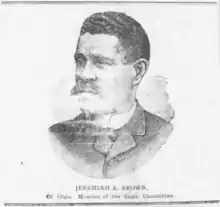 Jeremiah A. Brown or Jere A. Brown (November 14, 1841 – March 28, 1913) was a politician and civil rights activist in the American city of Cleveland, Ohio. Early in his life, Brown worked on steamboats with Mark Twain. He later moved to Cleveland, where he was elected to the Ohio House of Representatives in 1885 where together with Benjamin W. Arnett, he played an important role in fighting black laws, supporting education, and working for the civil rights of Ohio's African Americans. He also held numerous state and national political appointments.