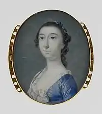 Theus typically confined himself to uncomplicated compositions, and the bulk of his portraits are bust-length works, approximately thirty by twenty-five inches at their largest; like many portraitists of the era, he also produced miniatures. Three larger-scale works by him exist. The first, a portrait of Elizabeth, wife of Peter Manigault, dates to 1757, and was meant to be the pendant to a portrait by Allan Ramsay.[1] That Manigault was familiar with Theus' work may be seen by the letter he wrote to his mother, which accompanied the Ramsay portrait home in April 1751, in which he wrote that "I desire Mr Theus may see it, as soon as convenient after it arrives....I’ll be extremely obliged to you, if you’ll let me know his Judgement..."[5] The source of Mrs. Manigault's pose is unknown, but is believed to have been taken from an English mezzotint, as was common at the time.[1] Only once more in his career did Theus work on such a scale, producing a pair of portraits, of Barnard Elliott, Jr. and his wife, around 1766. Elements of the portrait of Mrs. Elliott – including details of her costume, jewelry, and pose – have since been shown to have been taken from a number of contemporary English mezzotints. Theus frequently borrowed from English prints for his smaller works as well, and at least one historian has noted that many of his female sitters share identical poses and elements of costume, down to the folds and shadows in their dresses; each work is individualized with minor changes to various details.[1]