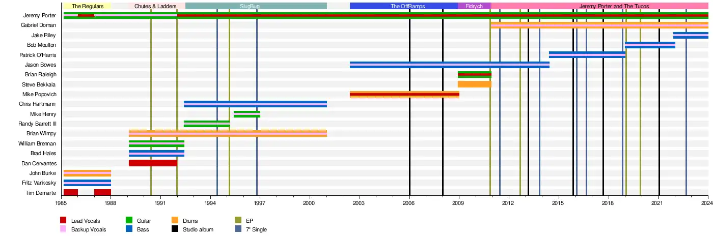 In September 1988, Jeremy Porter moved to Ypsilanti, Michigan,[12] where he attended Eastern Michigan University. After two years of failing to find like-minded musicians, Porter met Brian Wimpy, Brad Hales, Dan Cervantes and William Brennan who took him in as the fifth member of their new band Chutes and Ladders. The band played regionally for two years, including a trip to Philadelphia, where they opened up for the well known bands Tar and The Unsane, but only after (as a favor to the promoter) they agreed to tell people they were Cum Dumpster, the Detroit band originally booked for the show, who had cancelled with little notice. Porter and Brennan were the chief songwriters with Hales and Cervantes contributing occasionally. On August 12, 1991, Chutes & Ladders played with a young punk band from California called Green Day at a house party in Grosse Ile, MI, just a couple years before their breakout album Dookie!.[13]