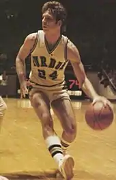 Jerry Sichting, the 6 ft 1 in (185 cm), 175 lb (79 kg) point guard from Martinsville, Indiana, attended Martinsville High School. In his junior year, he led the Artesians to an IHSAA Sectional title. He had an excellent senior season, leading his school to a 21–2 record and another IHSAA Sectional title;[1] he averaged 21 points, while shooting 53 percent from the field and 83 percent at the line in three seasons. Chosen as a 1975 Indiana All-Star, the team toured Europe and Russia.