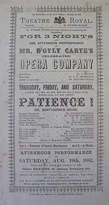In 1882 the D'Oyly Carte Opera Company performed Patience at the Theatre Royal