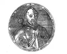 Jürgen von Farensbach [1] (1551–1602) (Russian: Юрий Францбек, Danish: Georg Farensbach, Polish: Jerzy Farensbach) was a Baltic German nobleman and Livonian general. Sent as the Ambassador of Livonian Confederation to Czar Ivan IV of Russia, for concluding a peace treaty, he entered the Russian service and won the battle on Oka against the Tatars on 1 August 1572. Later he served in the Danish and Polish armies. In 1586 Farensbach gained the rank a senator of the Polish crown granted by Sigismund III, whom he had assisted in gaining the throne of Poland. As field marshal of Poland he fought against the Swedish Empire, where he was killed in the attack on the castle of Fellin on 17 May 1602.[2]