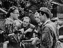 ![]() Warsaw Uprising: Jerzy Zarzycki "Pik" (on the left), correspondent of Referat Filmowy BiP KG AK, in a discussion with soldiers from the Starówka district | |