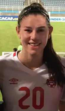In June 2014, she made her debut in the Canadian national program attending a camp with the Canada U15 team.[1] In 2018, she played with the Canada U17, helping them to a fourth place finish at the 2018 FIFA U-17 Women's World Cup.[24][25] She also played with the Canada U20 team, including being named to the squad for the 2018 CONCACAF Women's U-20 Championship.[26][1]